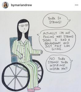 ‘Inspiring‘ is an interesting one. I know a lot of people struggle with this, none of us feel very inspiring for the sole fact that we are going through cancer treatment. But I do like to think that some of the things I write might inspire someone. That I inspire for the things I do in the face of adversity. But I know ‘inspiring’ can be seen as a demand that the person with cancer must always inspire as they go through it. I know people with disabilities don’t like to be told they’re inspiring just for trying to live their life, this picture springs to mind: