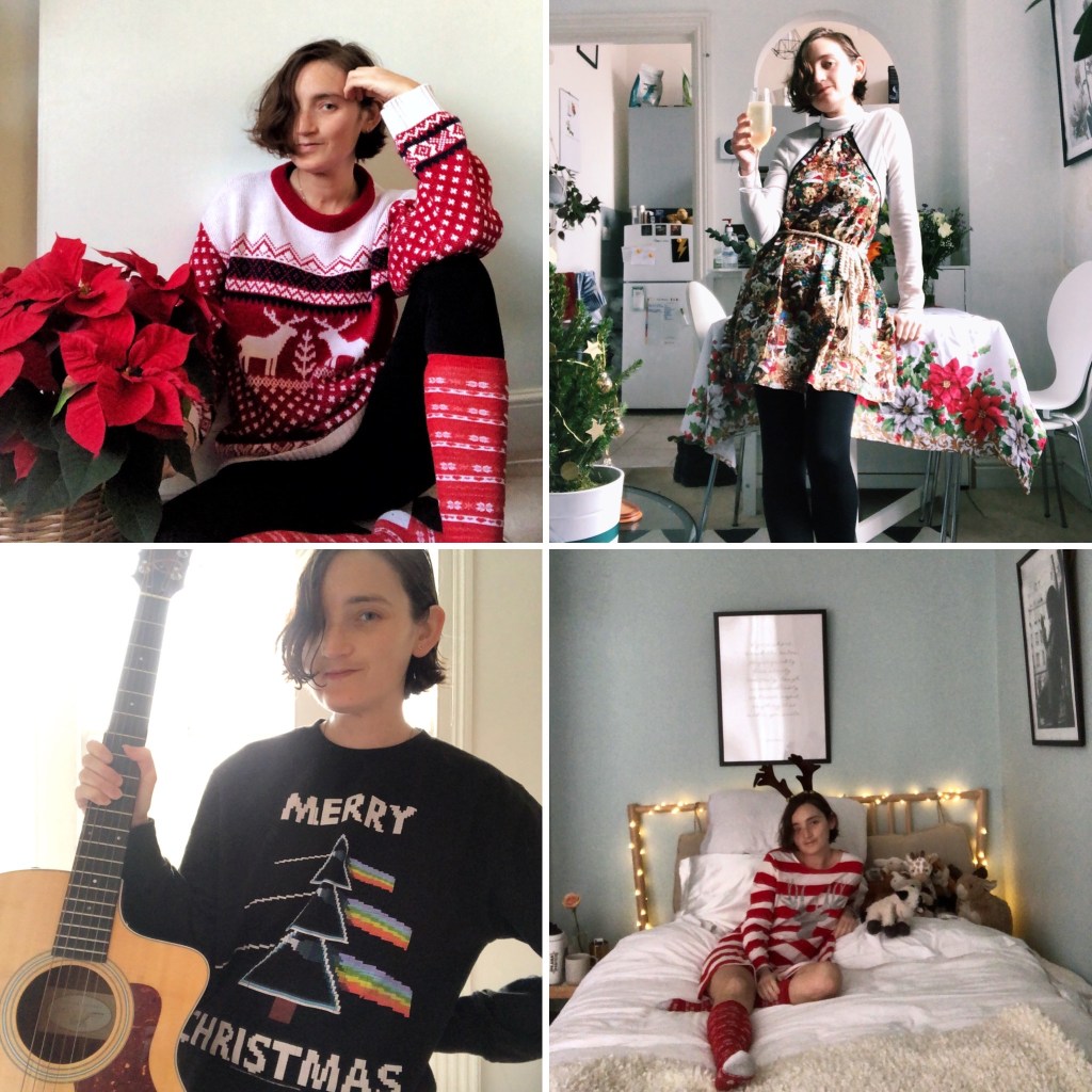 Here’s a selection of my Christmas outfits to make you smile. Not intentionally hiding my lack of eye, but with my hair no longer obscuring my vision, and the side of my face being numb, it tends to creep forwards. Reindeer antlers seems to fix that. No, I didn’t sleep in them.