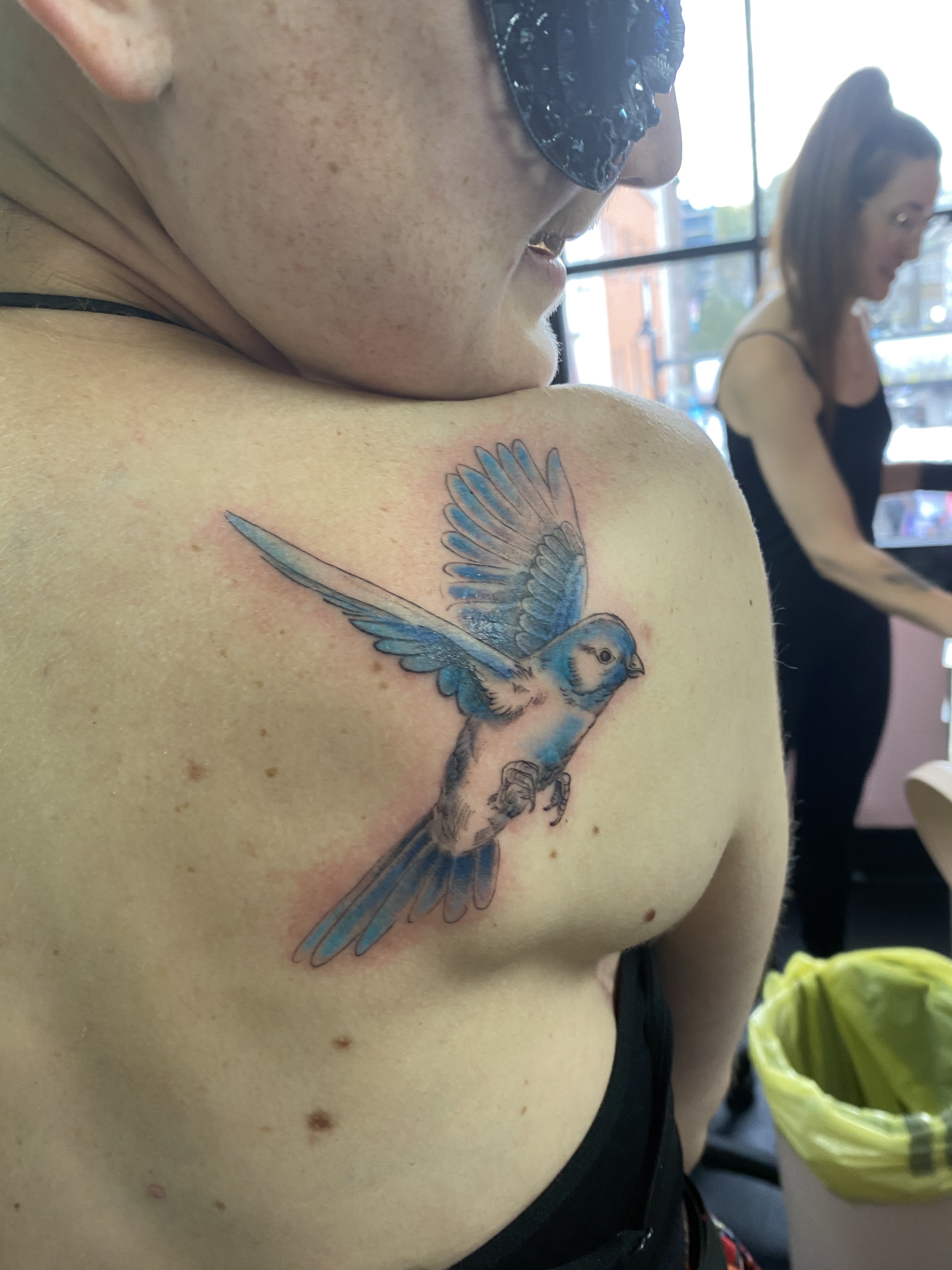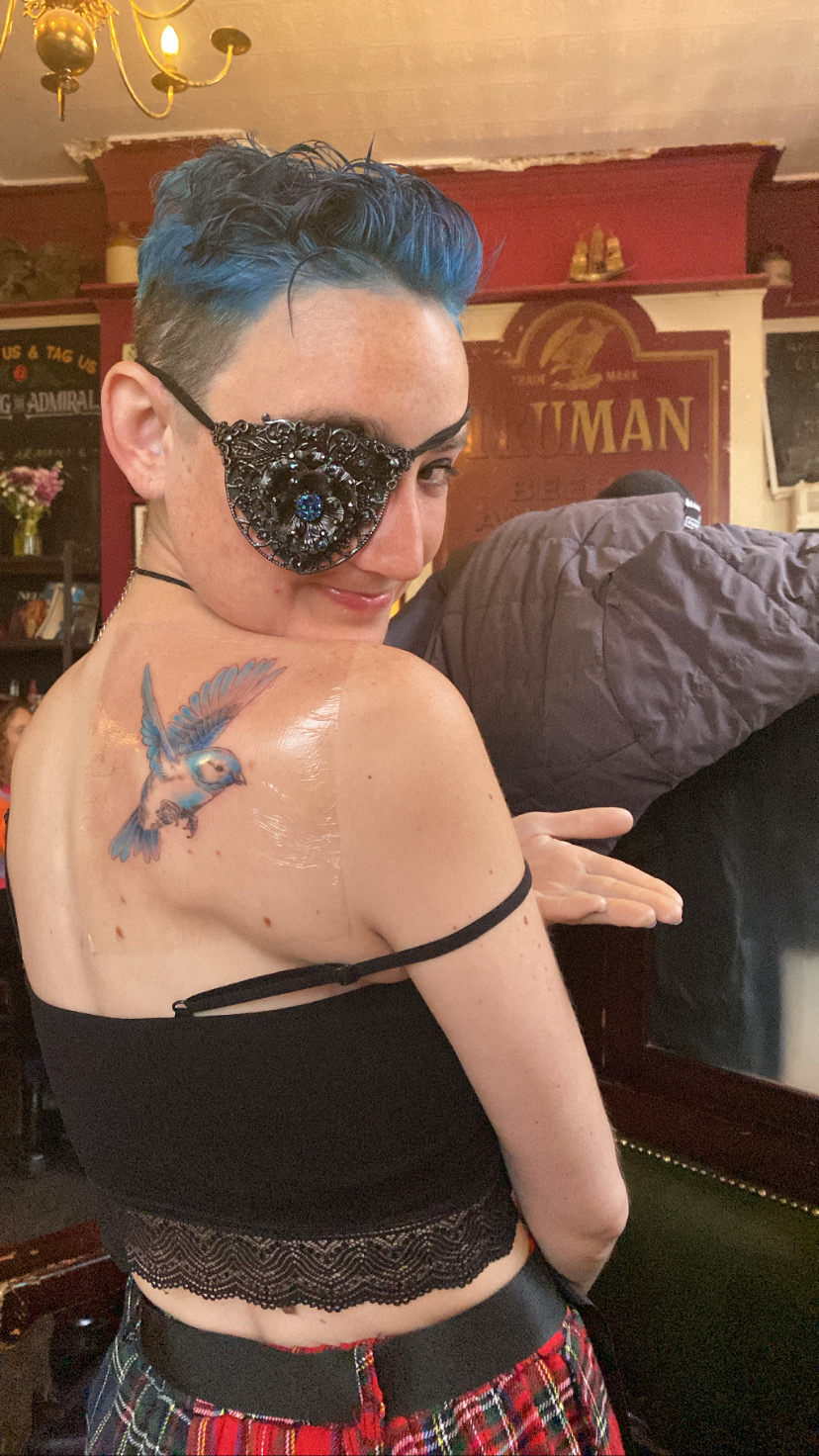 Yeah, I’ll be free. Just like that bluebird. I knew then that it was definitely the one. And I would get it on my back, on the side where they cut my shoulder out, way back in March 2018, to reconstruct my jaw with. The reconstruction that’s long gone, thanks to the first cancer recurrence. A bird on my broken wing. The meaning was endless.