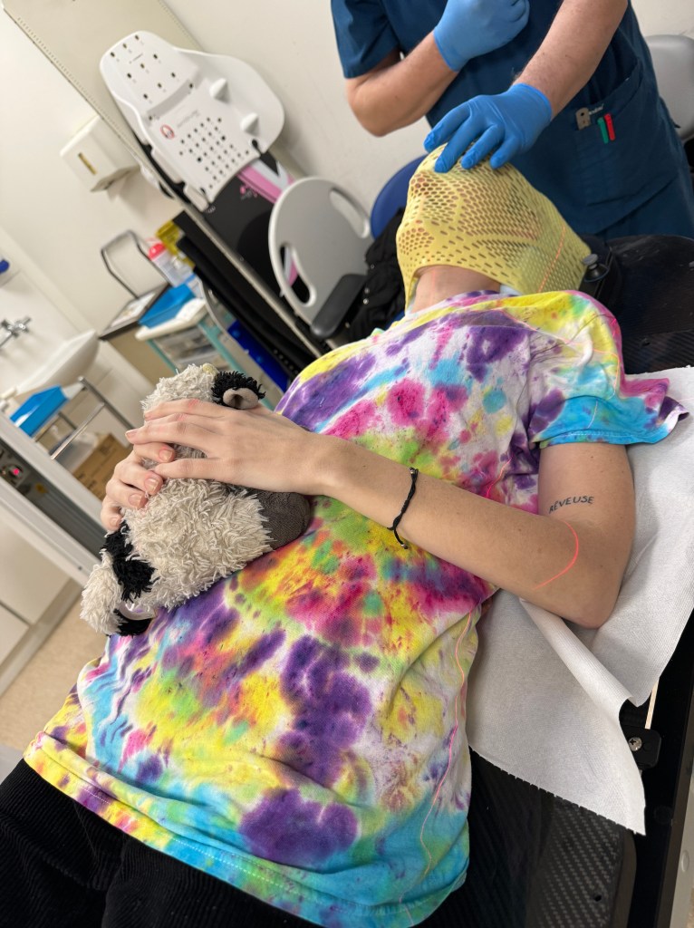 Instead of letting Mum lead me to where I needed to lie, for the mask fitting I had what felt  like a hundred hands all grabbing and pulling me. Even as one of the disembodied voices was trying to explain what was about to happen to me, I struggled to concentrate, as for some reason I still can’t understand, someone else was holding onto me from behind, their hands wrapped around my sides and ribs, in a way so unwelcomely intimate, it made my skin crawl.