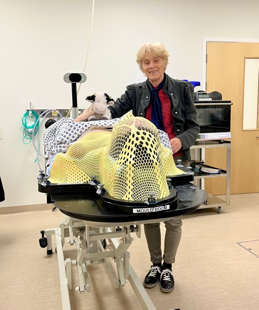 The new mask was noticeably more extensive and restrictive than the previous ones I’d had, which wasn’t a particularly enjoyable surprise, but the length of treatment (3 weeks, 15 sessions in total), was half what I had endured previously. I would do it. I would find a way to get through. As we were leaving, G followed us out. Her brain had clearly been working away In the background.